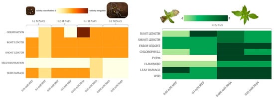 Heat maps representation of MeJA and MEF efficacy in mitigating the effects of salinity stress on hemp during seed germination (left panel) and early growth (right panel). A color gradient ranging from light yellow (or green) to brown (or dark green) indicates increasing mitigation effect of salinity stress (−2—salinity exacerbation; 2—salinity mitigation). For comprehensive analysis and interpretation of treatment effects, refer to the Discussion section.