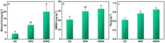 Figure 1. Mineral nitrogen (N, (a)), soil microbial biomass N (SMBN, (b)), and total N (TN, (c)) concentrations in soil under different treatments. Lowercase letters at the top of columns indicate statistical differences among treatments (p < 0.05), while error bars denote the standard error (n = 3). Unfertilized control (CK), N fertilization at the rates of 130 kg ha−1 (NPK) and 170 kg ha−1 (HNPK).