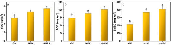 Figure 2. Soil organic carbon (SOC, (a)), dissolved organic carbon (DOC, (b)), and soil microbial biomass carbon (SMBC, (c)) concentrations in soil under different treatments. Lowercase letters at the top of columns indicate statistical differences among treatments (p < 0.05), while error bars denote the standard error (n = 3). Unfertilized control (CK), N fertilization at the rates of 130 kg ha−1 (NPK) and 170 kg ha−1 (HNPK).