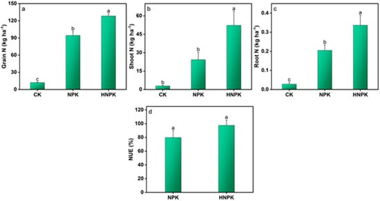 Figure 3. Nitrogen (N) uptake by different components of the wheat plant (ac), and N use efficiency (NUE, (d)) under different treatments. Lowercase letters at the top of columns indicate statistical differences among treatments (p < 0.05), while error bars denote the standard error (n = 3). Unfertilized control (CK), N fertilization at the rates of 130 kg ha−1 (NPK) and 170 kg ha−1 (HNPK).