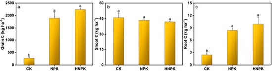 Figure 4. Carbon (C) accumulation by different components of the wheat plant (ac) under different treatments. Lowercase letters at the top of columns indicate statistical differences among treatments (p < 0.05), while error bars denote the standard error (n = 3). Unfertilized control (CK), N fertilization at the rates of 130 kg ha−1 (NPK) and 170 kg ha−1 (HNPK).