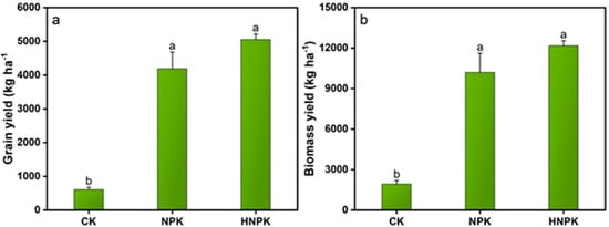 Figure 5. Grain yield (a) and biomass yield (b) of the wheat crop under different treatments. Lowercase letters at the top of columns indicate statistical differences among treatments (p < 0.05), while error bars denote the standard error (n = 3). Unfertilized control (CK), N fertilization at the rates of 130 kg ha−1 (NPK) and 170 kg ha−1 (HNPK).