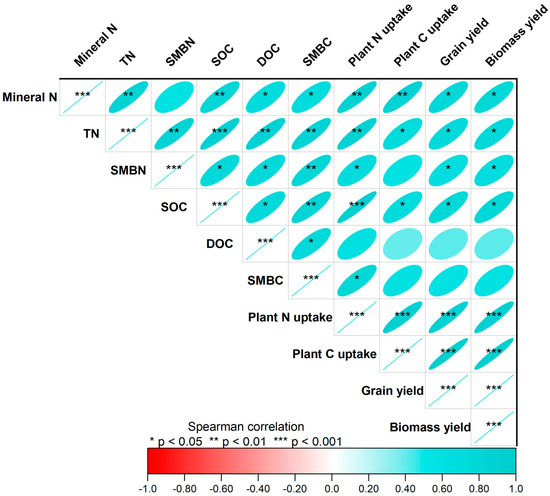 Spearman correlation analysis revealed that both grain and biomass yields were positively associated with mineral N, TN, SMBN, SOC, and plant N and C uptake parameters (Figure 6). Notably, DOC and SMBC did not exhibit significant relationships with either grain or biomass yields. The mineral N, total N, SMBN, SOC, and SMBC all demonstrated positive correlations with plant total N uptake. In contrast, only mineral N, TN, and SOC showed significant positive associations with total C accumulation by plants.