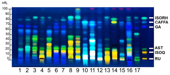 The visual examination of the HPTLC chromatograms showed both similarities and variations within the phenolic profiles of the PEs (Figure 1).