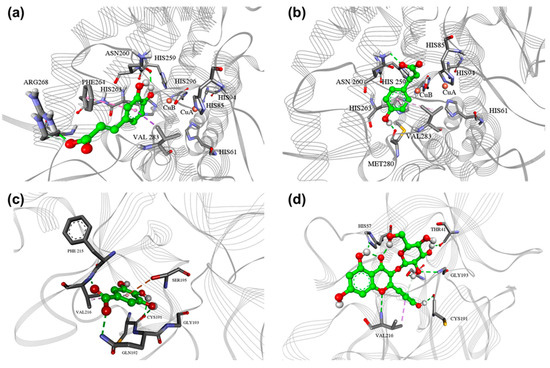 (a) CAFFA, (b) p-COUM, docked into the active site of tyrosinase, and (c) GA and (d) AST docked into the active site of PPE. The green color represents hydrophilic interactions, and the purple/gray color represents aromatic and other hydrophobic interactions.