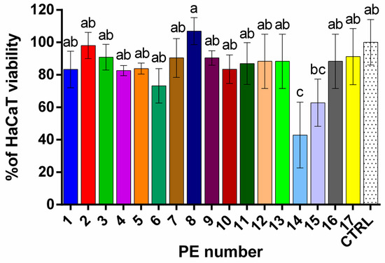 Percentages (%) of HaCaT cell viability after treatment with the investigated PEs (5 µg/mL concentration), as determined by Tukey’s multiple comparison test. Different letters indicate statistically significant differences in cell viability among samples at p < 0.05; CTRL stands for untreated control cells.