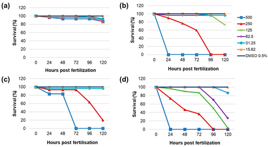 Acute toxicity of different concentrations of tested PEs in zebrafish embryos through 24–120 hpf: (a) PE 1; (b) PE 6; (c) PE 10; (d) PE 16.