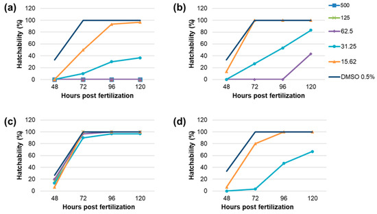 Influence of different concentrations of tested PEs on hatchability of zebrafish embryos through 48–120 hpf: (a) PE 1; (b) PE 6; (c) PE 10; (d) PE 16.