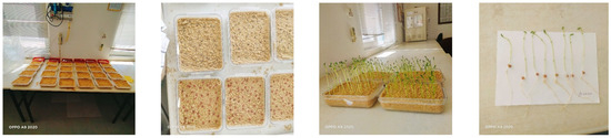Conducted in accordance with the rules of the International Seed Testing Association (ISTA, 2022) [17]. For each cultivar, 100 seeds per replicate were tested with four replications. Seeds were sown in 20 × 16 × 5 cm covered germination boxes containing sterilized (150 °C, 2 h) 0.9 mm sand at 60% moisture. The seeds were covered with 1–2 cm of the same sand, and boxes were incubated in a germination chamber at 20 ± 1 °C. Germination speed was calculated on the fifth day, and germination percentage on the eighth day (Figure 1).