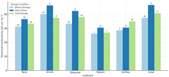 Electrical conductivity values (µS cm−1g−1) of forage pea cultivars under different storage conditions. Different lowercase letters above the bars indicate significant differences between cultivar means according to LSD test (p < 0.05).