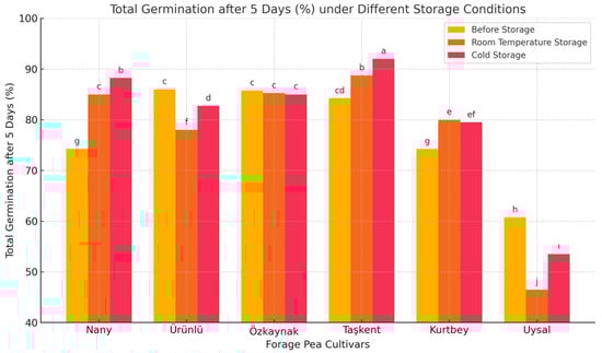 Seed germination is a critical indicator of seed viability and vigor, and it is directly influenced by genetic factors and storage conditions. The findings of this study clearly indicate that cold storage is more effective in preserving the total germination potential of forage pea (Pisum sativum L. var. arvense) seeds compared to room temperature storage. This result aligns with previous studies suggesting that low temperatures slow down metabolic activities and reduce seed deterioration over time [19,20].