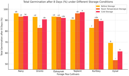 Total germination after 8 (%) of forage pea varieties at different storage periods (Before storage, Room temperature, Cold storage). Different letters indicate statistically significant differences (p < 0.05) according to LSD test.