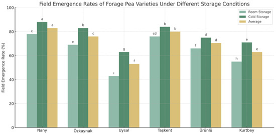Field emergence rates (%) of forage pea varieties under different storage conditions. Different lowercase letters above the bars indicate significant differences between cultivar means according to LSD test (p < 0.05).