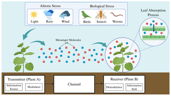 To achieve the quantitative transmission and analysis of plant stress signals, this study breaks through the limitation of traditional plant signal research, which only focuses on a single link, and innovatively constructs a Single-Input Single-Output (SISO) MC system. This novel framework holistically models the entire signaling process, from stress perception and molecular emission to signal propagation and reception, thereby enabling a systematic investigation of plant response mechanisms under diverse stress conditions. The core structure of the system is shown in Figure 2. Plant A (the transmitter) modulates and releases BVOCs; the central channel is where BVOCs act as signaling molecules; and Plant B (the receiver) perceives and demodulates the BVOCs to identify stress types and activate appropriate defensive responses [19,20]. Furthermore, to ensure model tractability within experimental constraints, we implement three key assumptions. First, the analysis considers only biotic and abiotic stresses that are known to induce volatile organic compound emission. Second, each stress type triggers the emission of a single characteristic compound, with no cross-interference between molecular species. Third, the channel maintains stable environmental conditions and assumes negligible molecular degradation throughout signal propagation.