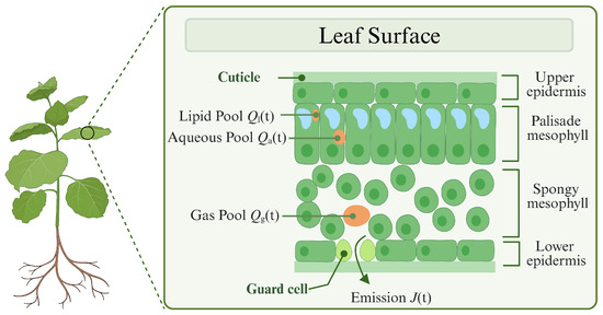 Upon production at a rate of , BVOCs are initially transported across cellular membranes into distinct intracellular compartments, where they undergo selective partitioning into lipid-phase or aqueous-phase storage pools [24]. As illustrated in Figure 3, these volatile organic compounds then progressively diffuse through passive transport into the gas-phase reservoir within intercellular spaces, culminating in their regulated release into the atmosphere through stomatal regulatory mechanisms [25]. The trans-compartmental transport dynamics can be represented as follows: