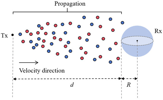 In this section, we analyze the propagation process of BVOCs and establish a corresponding channel model. To simplify the analysis, the emitting plants will be treated as point sources, while the receiver plants will be modeled as a perfectly absorbing sphere with a radius R. The distance between the transmitter and receiver is denoted as d, and a variable wind speed will be included in the channel to simulate natural environmental conditions, as illustrated in Figure 4.