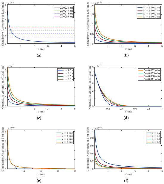 Figure 5d demonstrates the relationship between different diffusion coefficients and absorption amounts. The experimental data were obtained from [32]. At the same distance (0.2 m), absorption gradually decreases as the diffusion coefficient D increases; this phenomenon can be attributed to the enhanced diffusion of BVOCs in directions other than the downwind direction. Furthermore, at greater distances (1 m), the variation in absorption amounts across different diffusion coefficients becomes negligible, suggesting that beyond a certain distance, environmental factors exert a more dominant influence over diffusion effects.