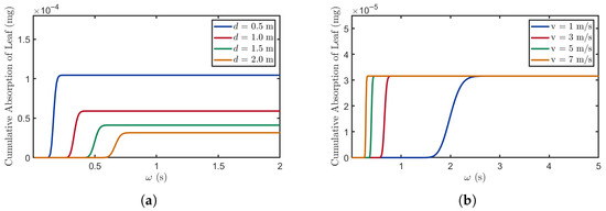 This section primarily explores the relationship between propagation time and leaf absorption. Figure 6 depicts the trends in leaf BVOC absorption under varying distance and wind speed conditions. As propagation time increases, the cumulative absorption of the leaves gradually increases.