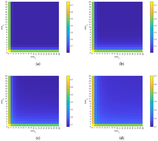 The impact of SNR on DER. (a) , , , , , , , . (b) . (c) . (d) . All other parameters remain constant.