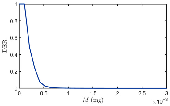 Figure 9 demonstrates an inverse relationship between DER and the quantity of BVOCs released by the transmitter, reflecting improved system performance with increased emission. At low emission levels M (0 mg to 0.00003 mg), DER reaches 1 due to either complete BVOC depletion in the channel preventing molecular arrival at the receiver, or due to interference from neighboring plant molecules causing signal detection failure. As M increases, the DER decreases progressively due to enhanced BVOC flux reaching the receiver, enabling sufficient molecular absorption by leaves to exceed the minimum detection threshold. Furthermore, the steep initial decline indicates high sensitivity to emission changes in the low-power regime, while the eventual saturation above approximately M (0.001 mg) suggests the existence of a fundamental performance bound. This limitation may arise from either the maximum capacity of stomatal absorption rate, enzymatic reaction velocity, or intracellular signal transduction pathways in the receiver plant leaves, or from the inherent maximum mutual information rate of the molecular diffusion channel itself.