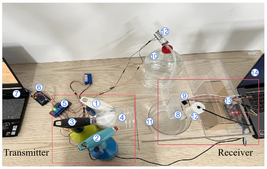 Figure 10 illustrates the overall structure of the platform. The transmitter module primarily consists of three electronic aerosolizers and a collection pipe. The white aerosolizer (Aerosolizer 1, PH-1001, Xie Bingran Co., Ltd., Ningbo, China) contains red pigment dye, representing the BVOCs emitted by plants under a specific abiotic stress; the blue aerosolizer (Aerosolizer 2, PH-1001, Xie Bingran Co., Ltd., Ningbo, China) is filled with blue pigment dye, symbolizing the BVOCs released by plants under a particular biotic stress. The black aerosolizer (Aerosolizer 3, PH-1001, Xie Bingran Co., Ltd., Ningbo, China) is used to periodically clean any residual pigment molecules in the air after each emission, thus minimizing the impact of previously emitted pigment on the experiment and ensuring the consistency of each spray event. The collection device (Device 4) connects the three aerosolizers and is responsible for gathering the released pigment molecules, ensuring that the pigment entering the air channel originates from the same position. Additionally, the transmitter is equipped with a control system, which includes a relay (Relay 5, Risym 12V, Shenzhen Kobe Electronics Technology Co., Ltd., Shenzhen, China) and an Arduino development board (Board 6, Arduino UNO, Arduino AG, Turin, Italy). The relay connects the development board to the electronic aerosolizers via jumper wires, enabling effective signal transmission and precise control. The other end of the Arduino board is connected to a laptop (Laptop 7), where a program runs to precisely control the emission behavior of the three electronic aerosolizers. We can set the working parameters of the aerosolizers through the computer interface, such as spraying frequency, duration, and amount, in order to simulate a variety of environmental scenarios.