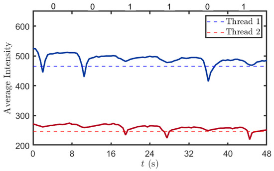 In the experiment, we defined the transmission sequence at the transmitter module as “001101.” As shown in Figure 11, if red pigment is transmitted in the current time slot, the blue channel values of the spectral sensor exhibit a significant decrease. This is because red pigment has a pronounced absorption peak in the blue–green wavelength range (450–500 nm). Since red and blue are complementary colors, an increase in the concentration of red pigment in the solution enhances its absorption of blue light, leading to a reduction in the light intensity value detected by the blue channel of the spectral sensor. Similarly, if blue pigment is transmitted in the current time slot, the corresponding value in the red channel of the spectral sensor will also show a significant decrease. Based on the above-described principles, we established two thresholds (465 and 247); values below these thresholds indicate the successful detection of the target pigment, thereby enabling the identification of the pigment molecules in the current time slot.