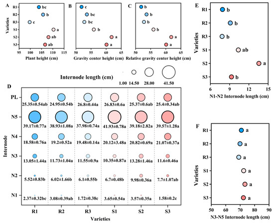 Comparison of main stem height and internode length of different high-quality conventional rice varieties. (A) Plant height (cm); (B) gravity center height (cm); (C) relative gravity center height (%); (D) Internode length (cm); (E) N1–N2 internode length (cm); (F) N3–N5 internode length (cm). R1–R3 represent lodging-resistant varieties, S1–S3 represent lodging-susceptible varieties. PL represents panicle length, N1–N5 represent the 1st to 5th internodes from the base upwards, respectively. Different lowercase letters represent statistically significant differences between varieties for the same indicator.
