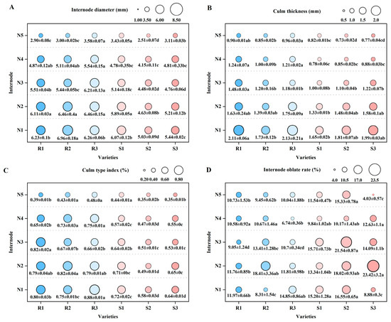 Comparison of main stem internode physical traits of different high-quality conventional rice varieties. (A) Internode diameter (mm); (B) culm thickness (mm); (C) culm type index (%); (D) internode oblate rate (%). R1–R3 represent lodging-resistant varieties, S1–S3 represent lodging-susceptible varieties. N1–N5 represent the 1st to 5th internodes from the base upwards, respectively. Different lowercase letters represent statistically significant differences between varieties for the same indicator.