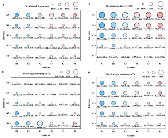 Comparison of stem and sheath plumpness traits of different high-quality conventional rice varieties. (A) Leaf sheath length (cm); (B) sheath phimosis degree (%); (C) stem weight ratio (mg cm−1); (D) sheath weight ratio (mg cm−1). R1–R3 represent lodging-resistant varieties, S1–S3 represent lodging-susceptible varieties. N1–N5 represent the 1st to 5th internodes from the base upwards, respectively. Different lowercase letters represent statistically significant differences between varieties for the same indicator.