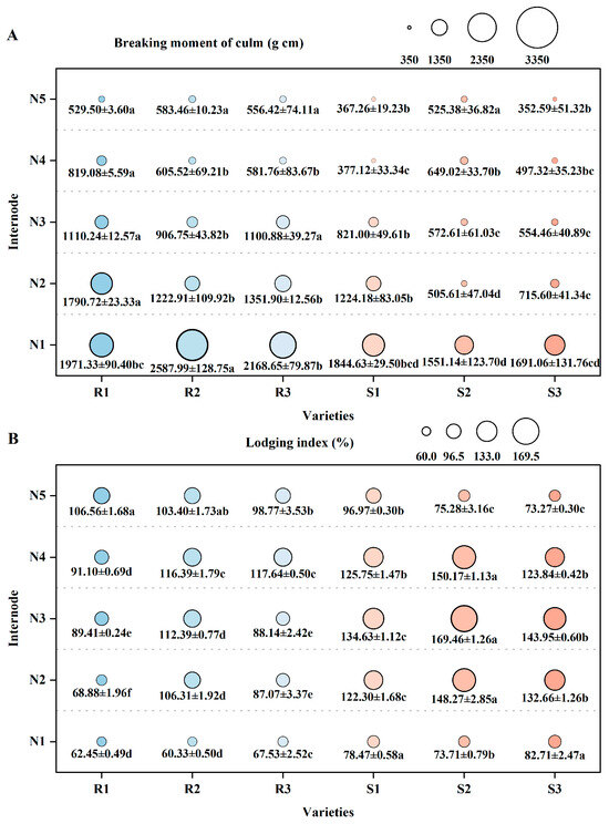 Comparison of lodging resistance of different high-quality conventional rice varieties. (A) Plant-breaking moment (g cm); (B) lodging index (%). R1–R3 represent lodging-resistant varieties, S1–S3 represent lodging-susceptible varieties. N1–N5 represent the 1st to 5th internodes from the base upwards, respectively. Different lowercase letters represent statistically significant differences between varieties for the same indicator.
