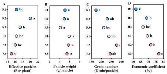 Comparison of yield-related traits of different high-quality conventional rice varieties. (A) Effective panicles (Per plant); (B) panicle weight (g/panicle); (C) Grain numbers (Grain/panicle); (D) Economic coefficient (%). R1–R3 represent lodging-resistant varieties, S1–S3 represent lodging-susceptible varieties. Different lowercase letters represent statistically significant differences between varieties for the same indicator.