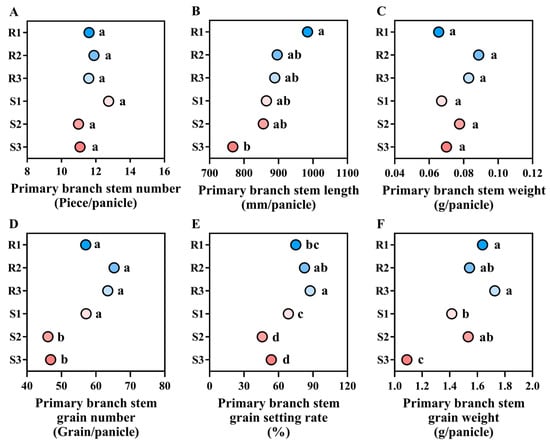 Comparison of main stem primary branch traits of different high-quality conventional rice varieties. (A) Primary branch stem number (Piece/panicle); (B) primary branch stem length (mm/panicle); (C) primary branch stem weight (g/panicle); (D) primary branch stem grain number (Grain/panicle); (E) primary branch stem grain setting rate (%); (F) primary branch stem grain weight (g/panicle). R1–R3 represent lodging-resistant varieties, S1–S3 represent lodging-susceptible varieties. Different lowercase letters represent statistically significant differences between varieties for the same indicator.