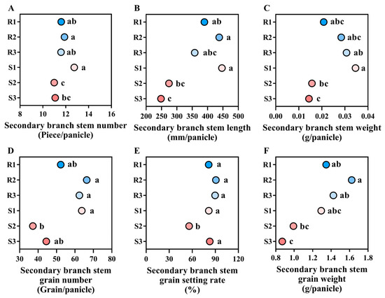 Comparison of secondary branch traits of different high-quality conventional rice varieties. (A) Secondary branch stem number (Piece/panicle); (B) secondary branch stem length (mm/panicle); (C) secondary branch stem weight (g/panicle); (D) secondary branch stem grain number (Grain/panicle); (E) secondary branch stem grain setting rate (%); (F) secondary branch stem grain weight (g/panicle). R1–R3 represent lodging-resistant varieties, S1–S3 represent lodging-susceptible varieties. Different lowercase letters represent statistically significant differences between varieties for the same indicator.