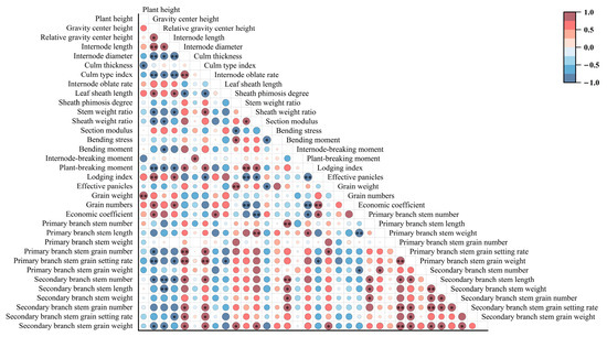 Correlation analysis was conducted on the main stem internode physical traits, stem and sheath plumpness traits, main stem mechanical properties, yield-related traits, and panicle characteristics of the N2 internodes (Figure 9). We focused on the correlation between panicle characteristic indicators and stem lodging indicators. Based on the differences in internode length and culm thickness, further compare the culm type index and internode oblate rate of each internode of the main stem of different varieties. There is a highly significant positive correlation between plant height and panicle weight (r = 0.96 **). The gravity center height is significantly positively correlated with the grain numbers and the economic coefficient (r = 0.88 *, 0.83 *). And there is a significant or highly significant negative correlation with the primary branch stem grain number and grain setting rate; and secondary stem number and grain weight. Meanwhile, the relative gravity center height is significantly or highly significantly negatively correlated with the secondary branch stem number, length, and grain weight. The internode length is significantly positively correlated with the grain numbers (r = 0.87 *), while it is significantly negatively correlated with the primary branch stem grain setting rate, secondary branch stem number, and secondary branch stem grain setting rate. The internode diameter is significantly or highly significantly positively correlated with the primary branch stem grain number and grain setting rate; and secondary branch stem number, grain number, grain setting rate, and grain weight. There is a highly significant positive correlation between sheath phimosis degree and number of effective panicles (r = 0.98 **). The plant-breaking moment is significantly positively correlated with the primary branch stem length (r = 0.82 *), while it is significantly or highly significantly negatively correlated with the grain numbers and the economic coefficient (r = −0.95 **, r = −0.88 *). The lodging index is significantly or highly significantly positively correlated with grain numbers and economic coefficient (r = 0.97 **, r = 0.85 *), and significantly negatively correlated with the primary branch stem grain setting rate (r = −0.81 *). In addition, there is a significant or highly significant positive correlation between primary stem traits, secondary stem traits, and between primary and secondary stem traits.