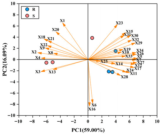 Principal component analysis was conducted on the main stem internode physical traits, stem and sheath plumpness traits, main stem mechanical properties, yield-related traits, and panicle characteristics of the N2 internodes. Note: X1: Plant height (cm); X2: Gravity center height (cm); X3: Relative gravity center height (%); X4: Internode length (cm); X5: Internode diameter (mm); X6: Culm thickness (mm); X7: Culm type index (%); X8: Internode oblate rate (%); X9: Leaf sheath length (cm); X10: Sheath phimosis degree (%); X11: Stem weight ratio (mg cm−1); X12: Sheath weight ratio (mg cm−1); X13: Section modulus (mm3); X14: Bending stress (g mm−2); X15: Bending moment (g cm); X16: Internode-breaking moment (g cm); X17: Plant-breaking moment (g cm); X18: Lodging index (%); X19: Effective panicles (per plant); X20: panicle weight (g/panicle); X21: Grain numbers (Grain/panicle); X22: Economic coefficient (%); X23: Primary branch stem number (Piece/panicle); X24: Primary branch stem length (mm/panicle); X25: Primary branch stem weight (g/panicle); X26: Primary branch stem grain number (Grain/panicle); X27: Primary branch stem grain setting rate (%); X28: Primary branch stem grain weight (g/panicle). X29: Secondary branch stem number (Piece/panicle); X30: Secondary branch stem length (mm/panicle); X31: Secondary branch stem weight (g/panicle); X32: Secondary branch stem grain number (Grain/panicle); X33: Secondary branch stem grain setting rate (%); X34: Secondary branch stem grain weight (g/panicle).