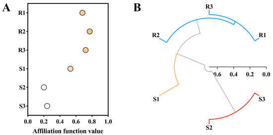 Further clustering analysis was conducted on six high-quality conventional rice varieties based on membership function values, and it was found that NX42 (R1), LD3 (R2), and SY17 (R3) were grouped together, and all showed lodging resistance in the field. The membership function values are all greater than or equal to 0.60. However, HGNZ (S2) and HGYZ (S3) are grouped together and are both varieties that exhibit lodging susceptibility in the field. The membership function values are all less than 0.30. In addition, the membership function value of JXSM (S1) is 0.53, which is separately clustered into one category. In the field, the lodging situation of this variety is intermediate, and the clustering results are consistent with reality. (Figure 11).