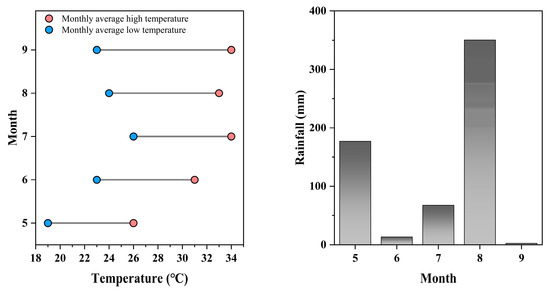 Monthly average temperature and average rainfall in the relevant experimental areas. (A) Monthly average high temperature and low temperature; (B) onthly average rainfall.