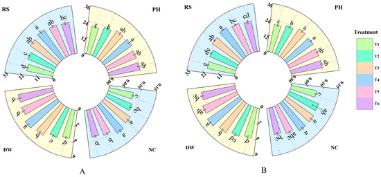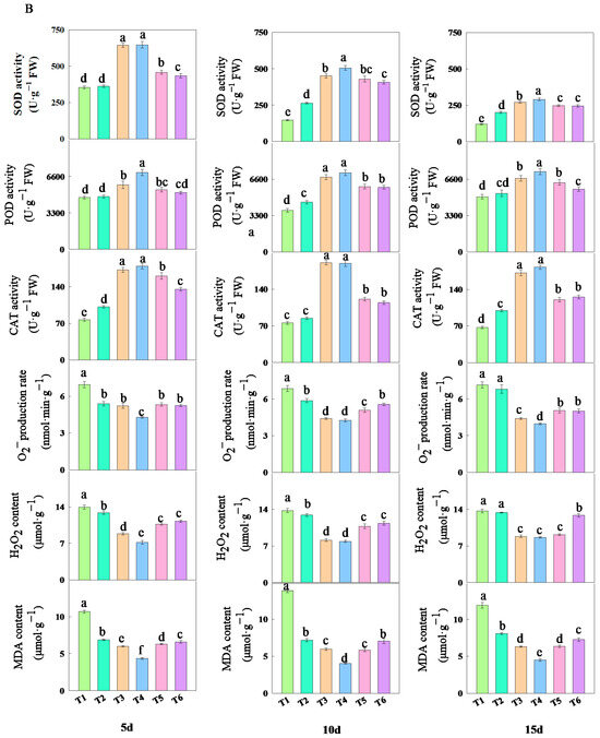 The following supporting information can be downloaded at: https://www.mdpi.com/article/10.3390/plants14182892/s1, Table S1: Percentage changes in NR, GS, GOT, and GPT under other treatments compared to T1 treatment. Table S2: Percentage changes in SOD, POD, CAT, O2−, H2O2, and MDA under other treatments compared to T1 treatment. Table S3: Percentage changes in soluble sugars, soluble proteins, free amino acids, and proline under other treatments compared to T1 treatment.