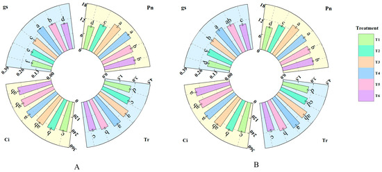 The effects of different concentrations of fulvic acid on the photosynthetic parameters of (A) (J 654) and (B) (J 100) under low-nitrogen stress. Pn: net photosynthetic rate (μmol·m−2s−1); Gs: stomatal conductance (mol·m−2s−1); Ci: intercellular CO2 concentration (μmol·mol−1); and Tr: transpiration rate (mmol·m−2s−1). Values are presented as means ± SD, n = 9. Different letters on the column represent significant differences (p < 0.05) between different treatments of the same rice varieties, based on LSD test.