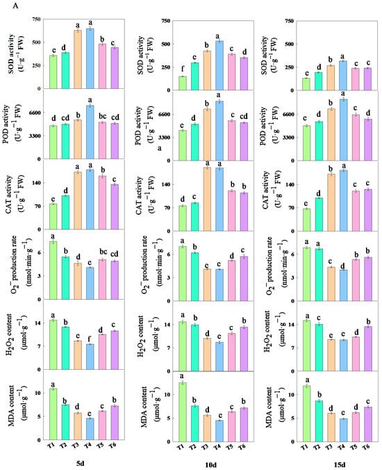 With the increase in the fulvic acid concentration, the O2− production rate, H2O2 content, and MDA content in the leaves decreased (Figure 5). Among them, the O2− production rate, H2O2 content, and MDA content showed a slight increase with the number of treatment days. Under T1 treatment, J 654 and J 100 consistently exhibited the highest rates of the O2− production rate and H2O2 and MDA contents. Conversely, under T4 treatment, they consistently showed the lowest rates of O2− production and H2O2 and MDA content (Table S2). Among them, the O2− production rate, H2O2 content, and MDA content under T3 and T4 treatments consistently remained at the lowest levels. After five days of treatment, compared with T1 treatment, the decrease in O2− production rates of J 654 under other treatments ranged from 26.47 to 44.90%; the decrease for J 100 ranged from 22.37 to 8.24%; the decrease in the H2O2 content of J 654 under other treatments decreased from 13.77 to 48.74%; the decrease for J 100 ranged from 7.77 to 48.54%; the decrease in the MDA content of J 654 under other treatments ranged from 31.00 to 57.4%; and the decrease for J 100 ranged from 35.83 to 59.36%. After 15 days of treatment, compared with the T1 treatment, the decrease in O2− production rates of J 654 under other treatments ranged from 2.24 to 41.51%; the decrease for J 100 ranged from 4.87 to 44.29%; the decrease in the H2O2 content of J 654 under other treatments ranged from 7.26 to 38.40%; the decrease for J 100 ranged from 2.37 to 36.87%; the decrease in the MDA content of J 654 under other treatments ranged from 26.97 to 58.74%; and the decrease for J 100 ranged from 32.15 to 62.11%.