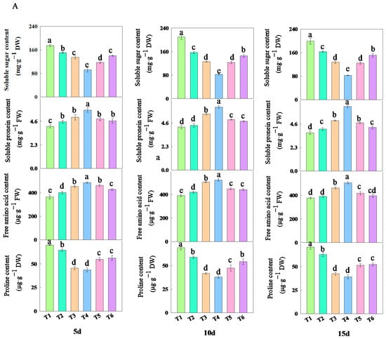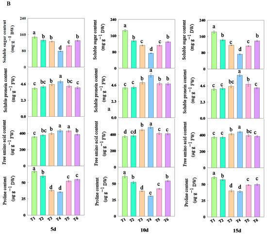 As shown in Figure 6, treatments with different concentrations of fulvic acid affected the changes in the content of osmotic adjustment substances in rice leaves. The addition of fulvic acid decreased the content of soluble sugars and proline while increasing the content of soluble proteins and free amino acids. Among them, the content of soluble sugars and proline under T3 and T4 treatments consistently remained at the lowest levels, while the content of soluble proteins and free amino acids consistently maintained the highest levels (Table S3). After 15 days of treatment, compared with the T1 treatment, the decrease in soluble sugar content of J 654 under other treatments ranged from 17.84 to 58.34%; the decrease for J 100 ranged from 21.33 to 59.93%; the decrease in the proline content of J 654 under other treatments ranged from 11.01 to 44.42%; the decrease for J 100 ranged from 5.55 to 35.47%; the increase in the soluble protein content of J 654 under other treatments ranged from 9.40 to 68.31%; the increase for J 100 ranged from 3.02 to 48.56%; the increase in the free amino acid content of J 654 under other treatments ranged from 3.38 to 33.96%; and the increase for J 100 ranged from 0.14 to 17.42%.