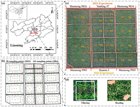 Geographic location of the study area and orthophotography of the field trial sites. (a) Field trials were conducted in Haicheng City, Liaoning Province, in 2023 and 2024. (b) Sub-maps of sampling points calibrated at individual key growth stages during the two-year trials, with red and green dots representing sampling points from 2023 and 2024 respectively. (c) Distribution of different varieties and nitrogen application rates during the two-year trials. (d) Sampling point calibration methods at different growth stages (PVC pipes used before canopy closure, and identification tags used for assistance after canopy closure).