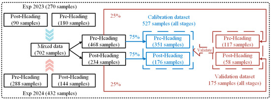 This study combined the rice AGB experimental data from 2023 and 2024 to create a comprehensive dataset with high data variability. To analyze the distinct features of various rice growth phases, the combined data were split into two subsets: pre-heading (including tillering, jointing, and booting) and post-heading (including heading). From each of these subsets, 75% of the data was randomly chosen to serve as the training set, and these training sets were then combined to create a comprehensive training set for all growth stages. The remaining 25% from each subset was allocated as the test set for validating the model. The process of data division is depicted in Figure 2.