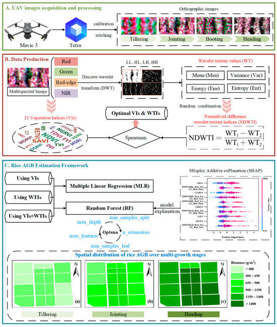 Flowchart of this study. (A) Use the UAV equipped with a multispectral sensor to obtain image data of rice tillering, jointing, boosting, and heading stages. (B) Calculate 21 VIs from multispectral images, extract WTs, and construct WTIs. (C) Framework for constructing the rice AGB estimation model.