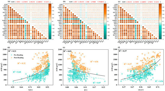Correlation analysis results and relationship diagrams between VIs and rice AGB. (a–c) show the correlation between VIs and rice AGB at pre-heading, post-heading, and all-stage, respectively. (d–f) show the relationship diagrams between the VIs with the highest correlation and rice AGB at pre-heading, post-heading, and all-stage, respectively.