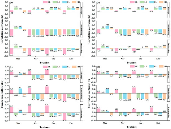 The correlation analysis results, derived from the training dataset, illustrate the relationship between the texture features obtained from multispectral images and AGB at various growth stages, as depicted in Figure 6. At pre-heading, the low-frequency texture features extracted from images of different bands generally demonstrated higher correlations with AGB than high-frequency texture features. Among these, low-frequency texture features from the near-infrared band exhibited higher correlations, with the highest correlation achieved by LL_NIR_Ene (|r| = 0.71). Following this, the red band presents a significant correlation achieved by LL_Red_Var (|r| = 0.65). In contrast, high-frequency texture features maintained correlations below 0.4, with the highest correlation being HH_Red_Mea (|r| = 0.31). It is important to highlight that the correlation between high-frequency texture features and AGB increased at post-heading and all-stage, with some high-frequency texture features even outperforming low-frequency texture features. Specifically, at post-heading, the correlations for high-frequency features were notably higher than those observed at pre-heading. The strongest correlations at post-heading were LL_NIR_Ene (|r| = 0.70) for low-frequency and HH_Red_Var (|r| = 0.61) for high-frequency features. For the all-stage analysis, the top correlations were LL_NIR_Ene (|r| = 0.44) and HH_NIR_Var (|r| = 0.37), respectively. Overall, both high-frequency and low-frequency texture features exhibited relatively weak correlations with AGB across pre-heading, post-heading, and all-stage. The high correlation of low-frequency texture features with AGB at the pre-heading suggests that low-frequency texture features may be more effective for estimating AGB during the vegetative growth stage of rice. Conversely, the increased correlation of high-frequency texture features with AGB at the post-heading and all-stage indicated that high-frequency texture features have certain application potential for estimating AGB during the reproductive growth stage of rice.