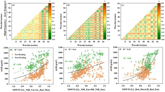 Correlation analysis results and relationship diagrams between NDWTIs and rice AGB. (a–c) show the correlation between NDWTIs and rice AGB at pre-heading, post-heading, and all-stage, respectively. (d–f) show the relationship diagrams between the NDWTI with the highest correlation and rice AGB at pre-heading, post-heading, and all-stage, respectively.