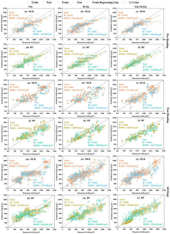 Rice AGB estimation model based on MLR and RF algorithms. (a–c,g–i,m–o) show the model results of MLR combined with three feature datasets at three different growth stages, respectively. (d–f,j–l,p–r) show the model results of RF combined with three feature datasets at three different growth stages, respectively. The training and testing datasets are distinguished by different colored scatter points.