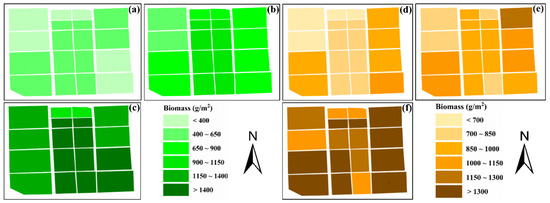 AGB (g/m2) map of rice based on Optuna-RF combined with VIs+NDWTIs. (a–c) show the distribution maps of AGB at pre-heading, post-heading, and all-stage of rice in 2023, respectively, while (d–f) show the distribution maps of AGB at pre-heading, post-heading, and all-stage of rice in 2024, respectively.