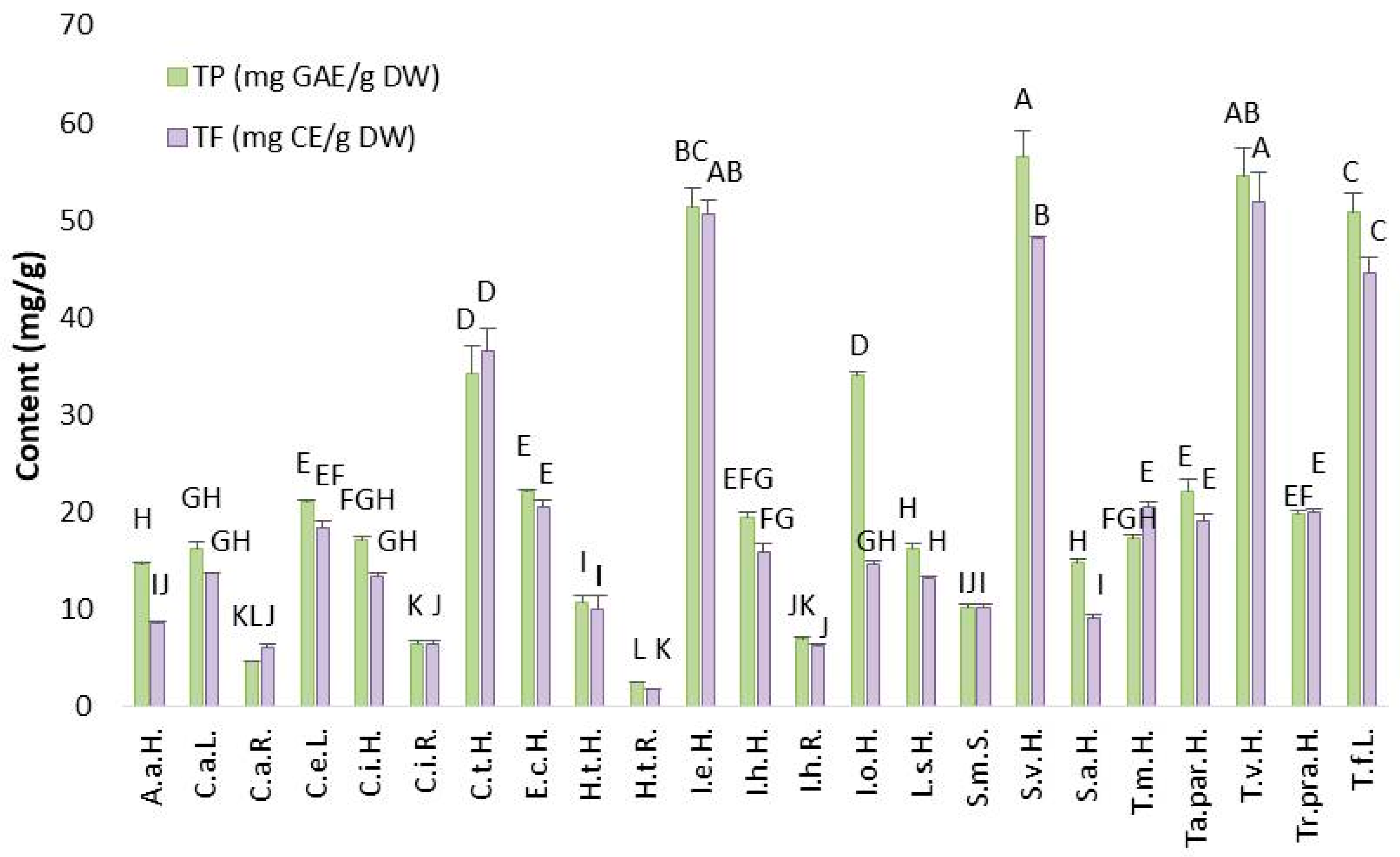 2.2.1. Total Phenolic (TP) and Flavonoid (TF) Content in Asteraceae Plant’s Extracts
